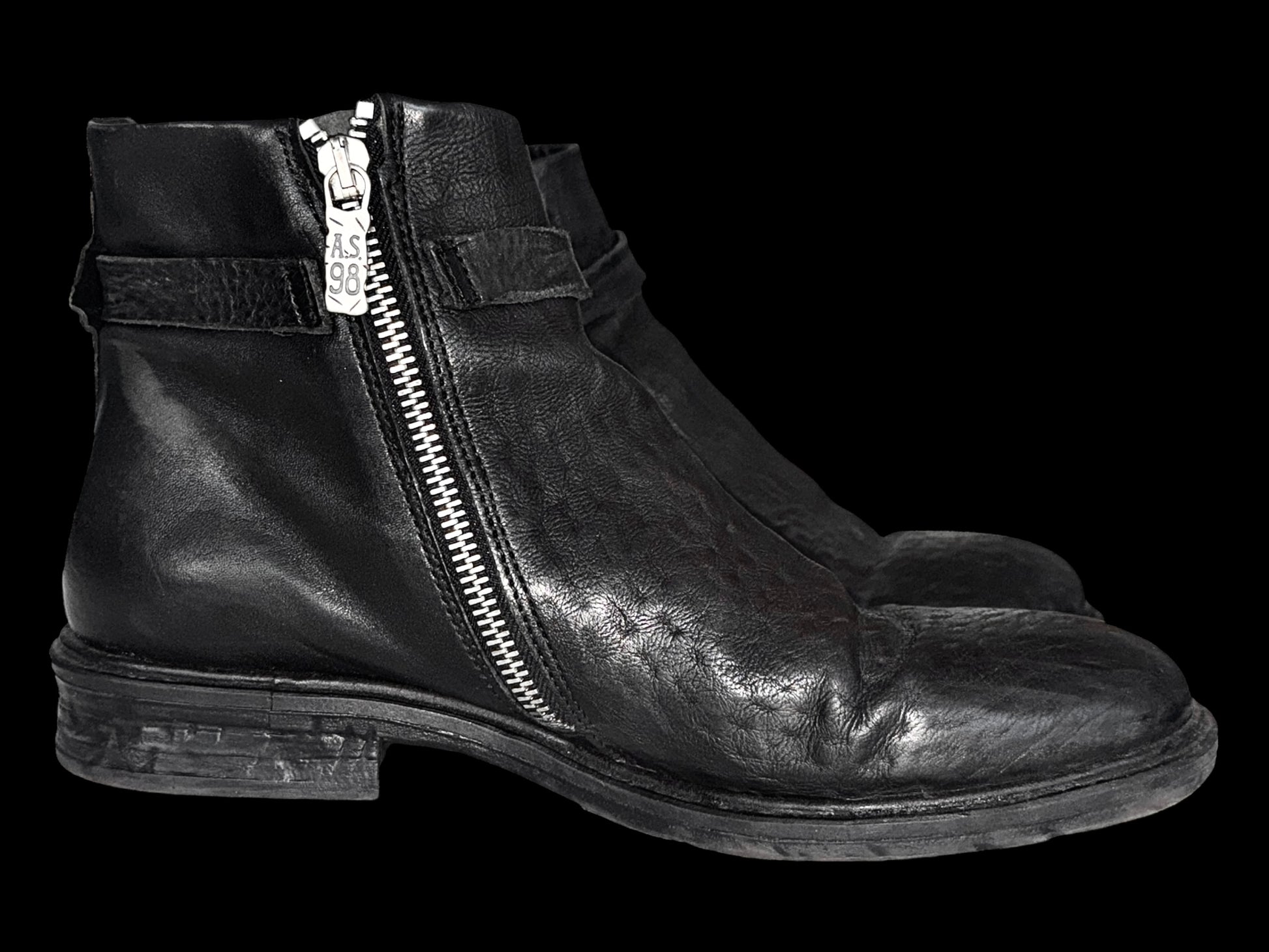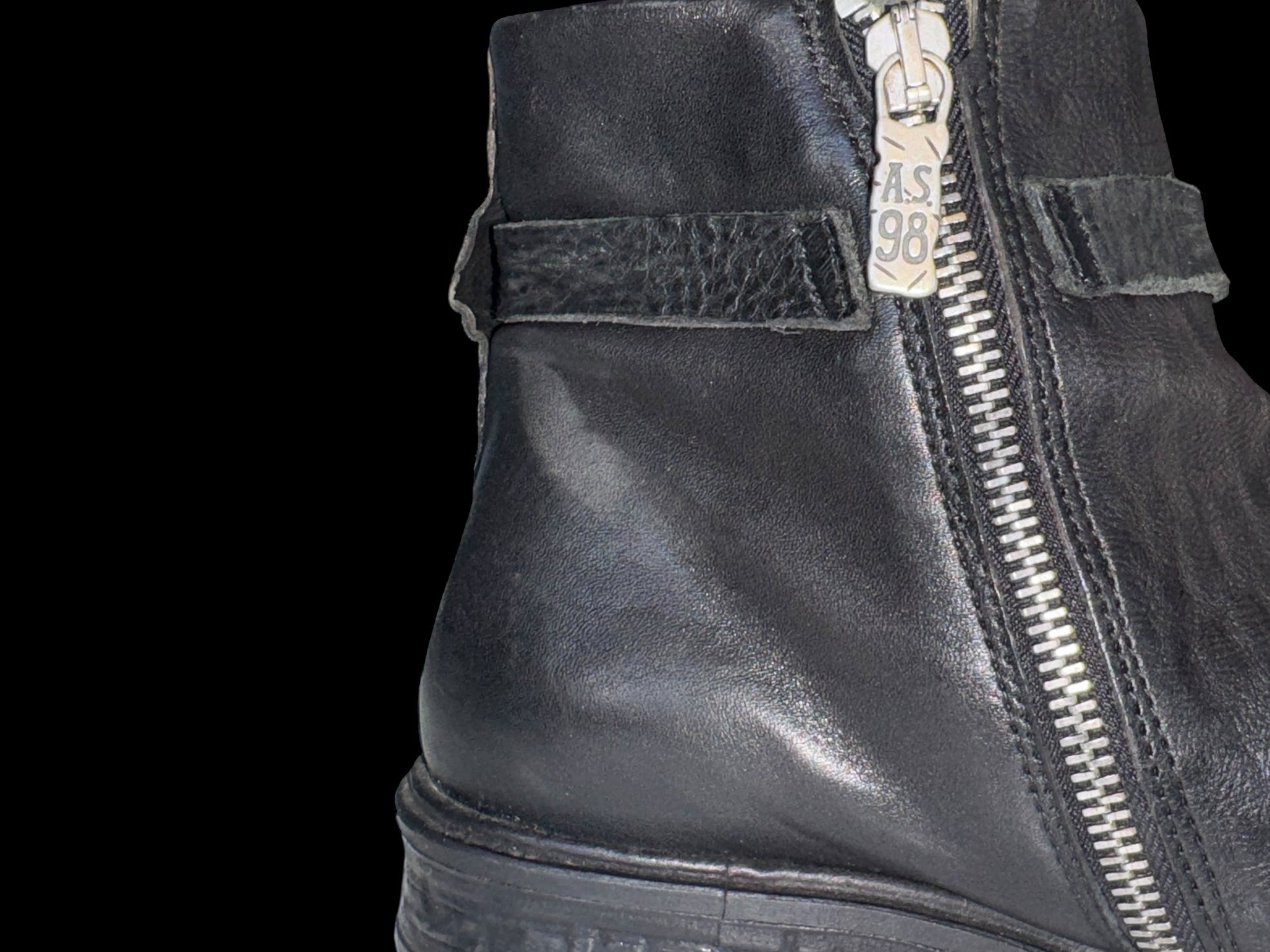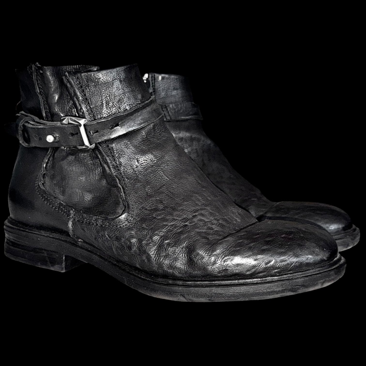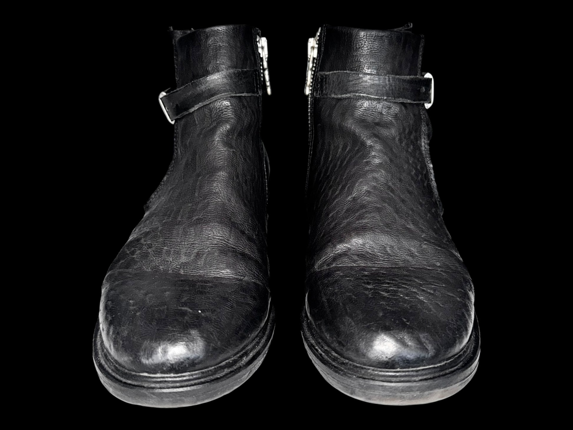 🧵 Матерiал: натуральна фактурна шкіра, ремінець з металевою пряжкою, бокова блискавка, щільна підошва.