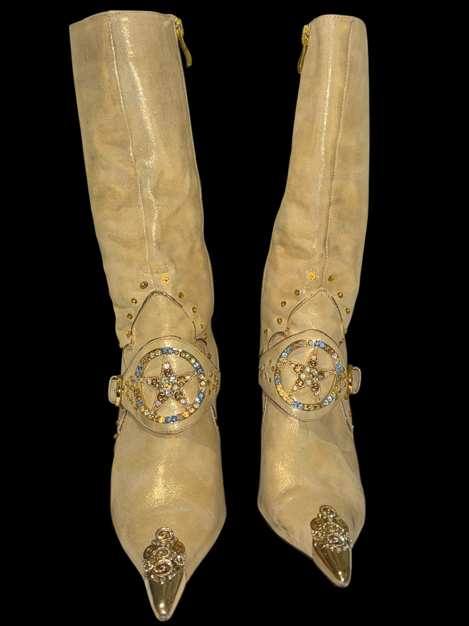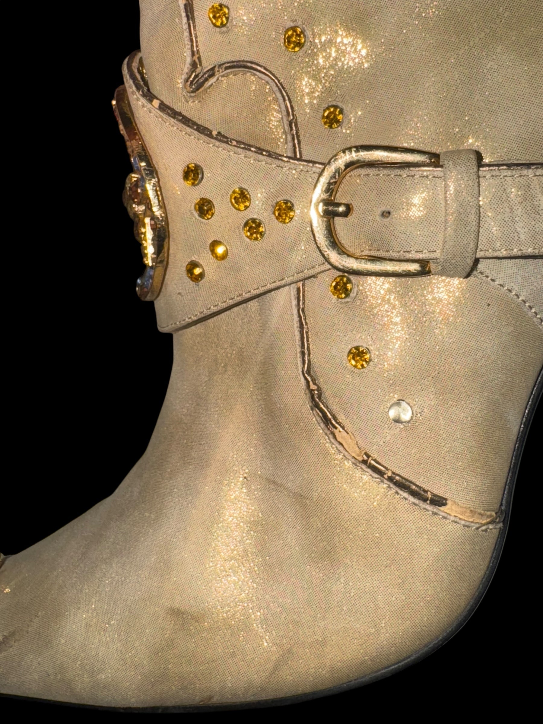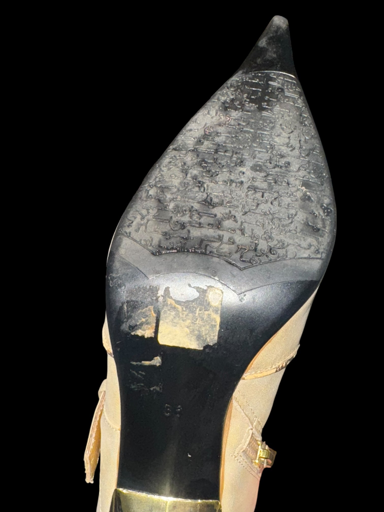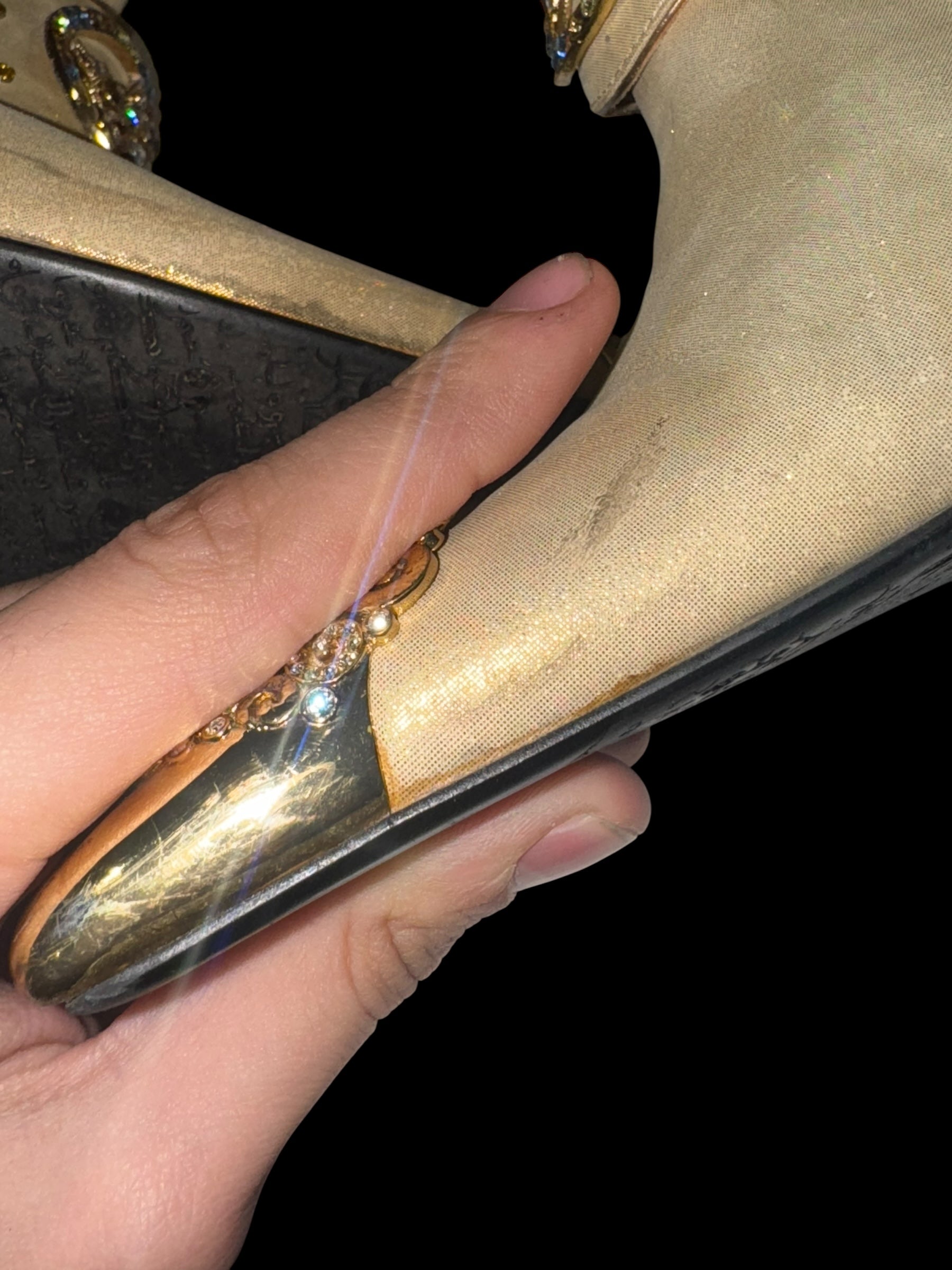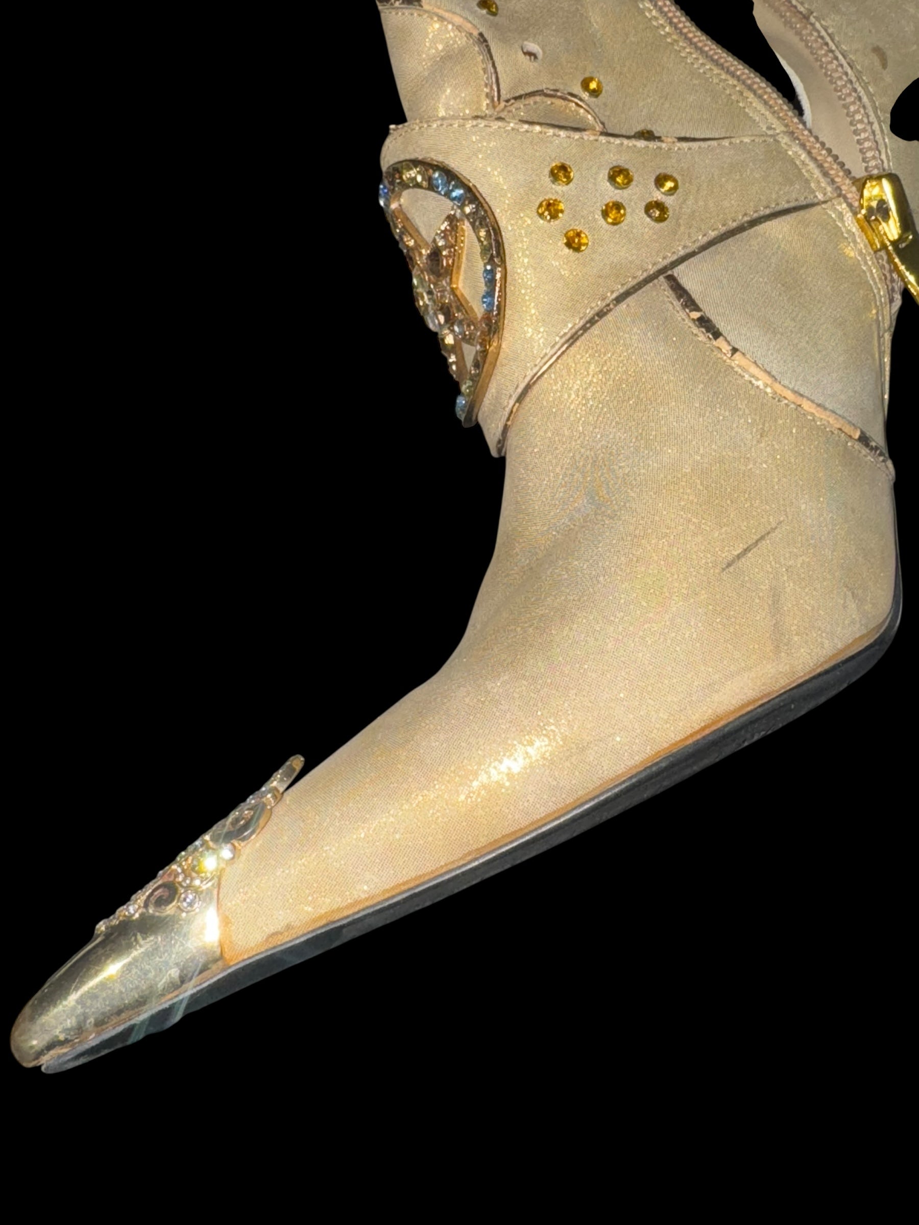 Стан: гарний вінтажний, є сліди носіння (підряпини на металевих каблуках і носках, легкі плями на тканині, незначні потертості). Все одно виглядають ефектно та готові до використання.